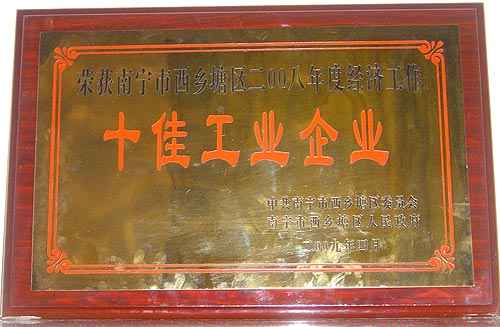 公司榮獲南寧市西鄉(xiāng)塘區(qū)二00八年度經(jīng)濟工作“納銳突出貢獻企業(yè)”、“十佳工業(yè)企業(yè)”榮譽稱號