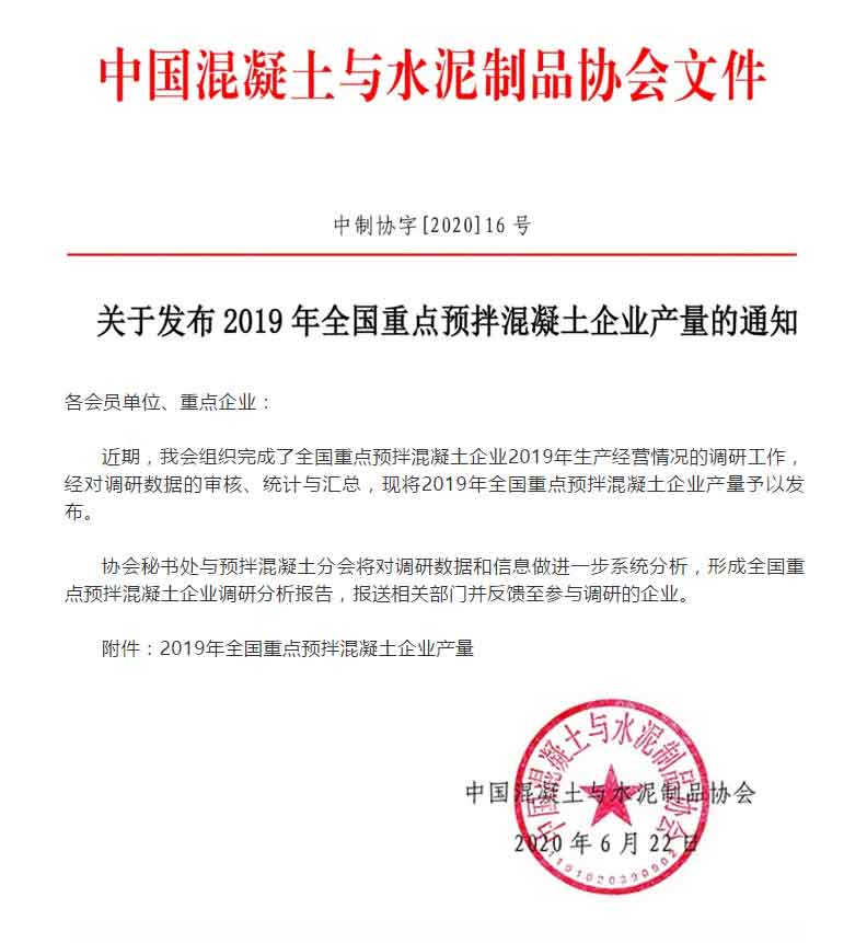 圖片新聞 (集團(tuán)公司·公司榮獲2019年全國重點(diǎn)預(yù)拌混凝土企業(yè)產(chǎn)量十強(qiáng)企業(yè))