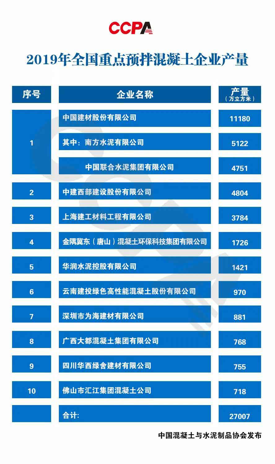 2019年全國重點(diǎn)預(yù)拌混凝土企業(yè)產(chǎn)量十強(qiáng)榜單