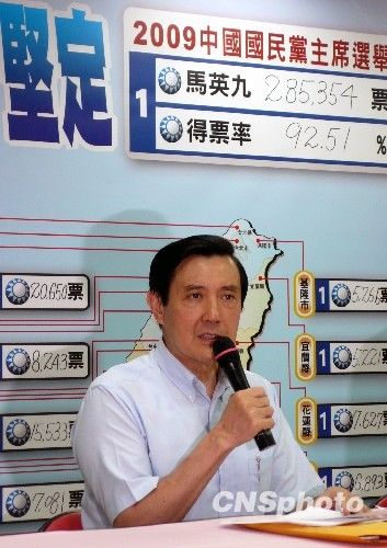 中國國民黨7月26日舉行黨主席、黨代表選舉,馬英九獲得28萬5354票,得票率93.87%,當選黨主席。圖為馬英九當晚在競選辦公室發(fā)表談話。 中新社發(fā) 劉舒凌 攝